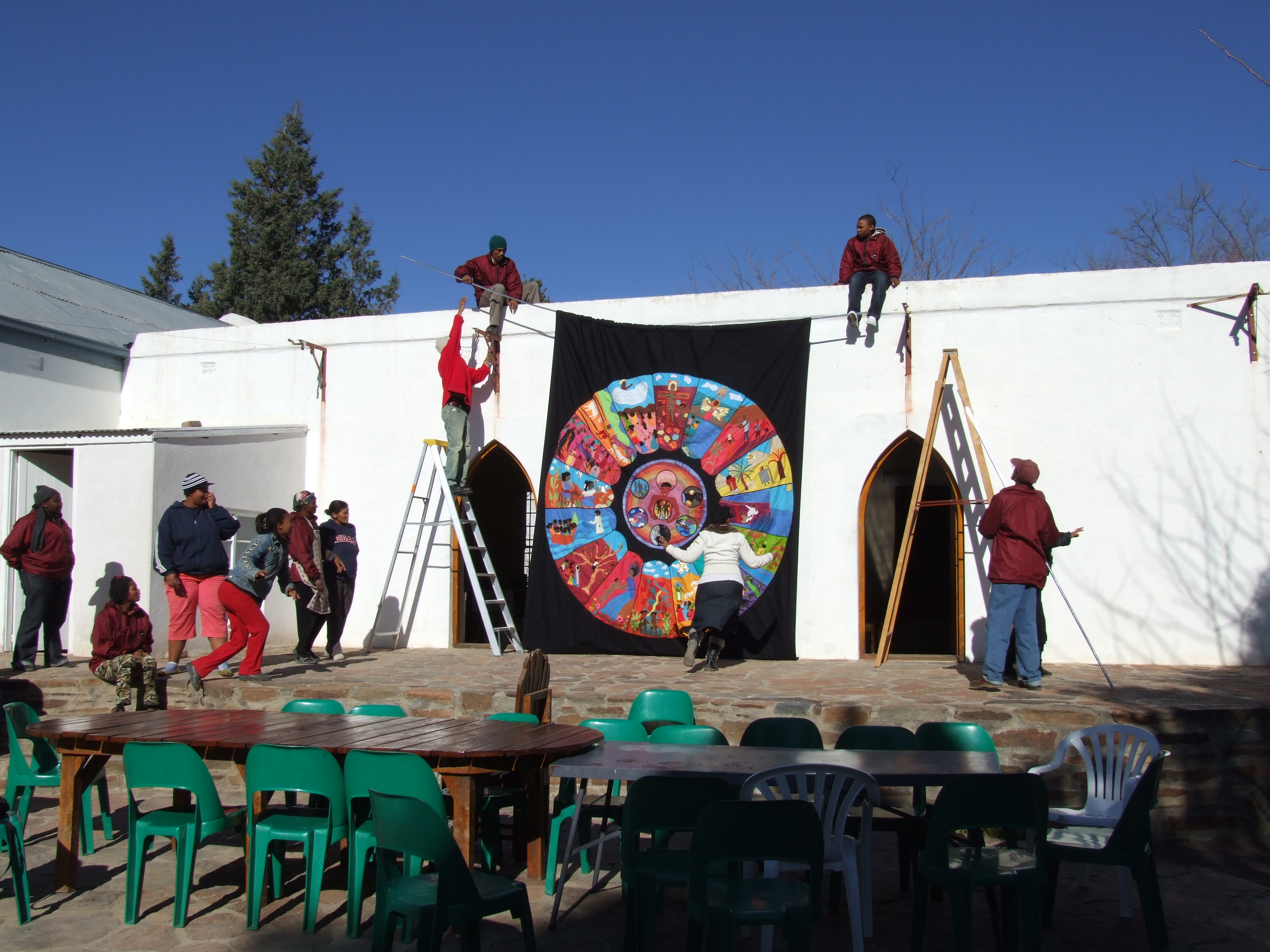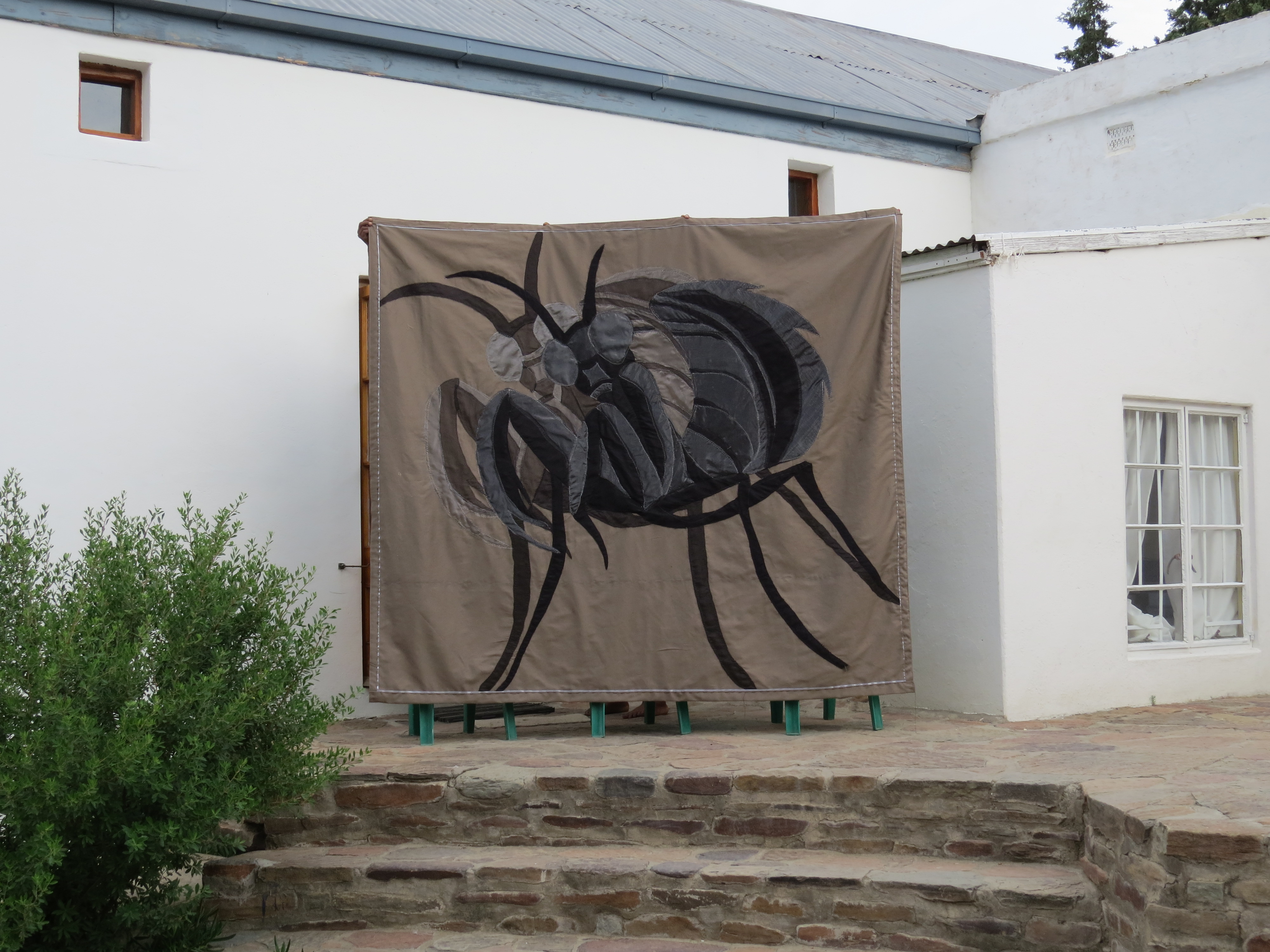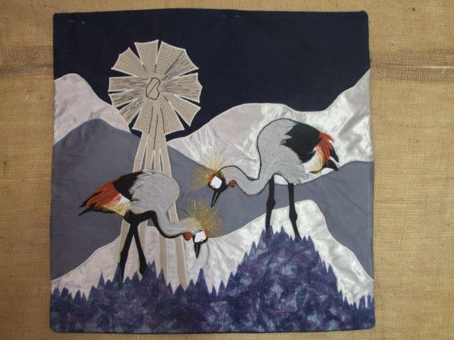 Our giant myth tapestries are on permanent exhibition at the First People Centre in Nieu Bethesda. We also have prints, cushion covers, and other art work for sale. Our lead artist, Sandra Sweers, heads the collective in making tapestries